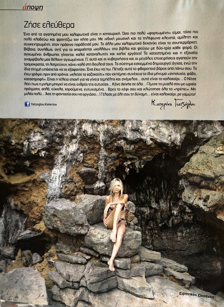 Ένα από τα αγαπηµένα µου χαλαρωτικά είναι η κηπουρική. Όσο πιο πολύ «φορτωµένη» είµαι, τόσο πιο πολύ κλαδεύω και φροντίζω τον κήπο µου. Με ινδική µουσική και τα τηλέφωνα κλειστά, αµίλητη και συγκεντρωµένη, στον πράσινο παράδεισό µου.