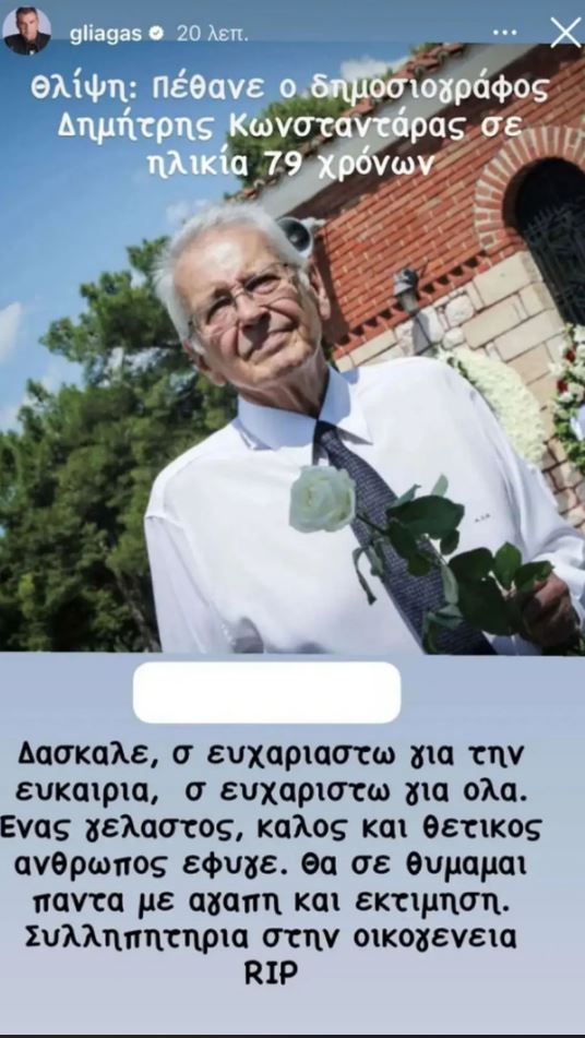 «Καλό ταξίδι σε έναν άνθρωπο που πάντα πίστευε στα νέα παιδιά. Σε έναν άνθρωπο που πάντα κάτι είχε να πει και να σου πει. Είτε με τα λόγια είτε απλά με την παρουσία του. Κουράγιο στην όμορφη οικογένεια που αφήνει πίσω», έγραψε η Ελεονώρα Μελέτη μοιράζοντας κι ένα στιγμιότυπο με τον Δημήτρη Κωνσταντάρα από την παρουσίαση του βιβλίου της.