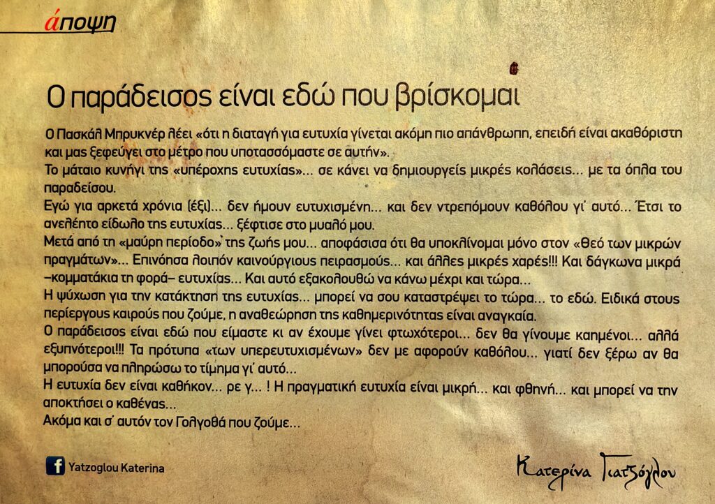 Ο παράδεισος είναι εδώ που είμαστε και αν έχουμε γίνει φτωχότεροι… δεν θα γίνουμε καημένοι… αλλά εξυπνότεροι!!! Τα πρότυπα “των υπερευτυχισμένων” δε με αφορούν καθόλου… γιατί δεν ξέρω αν θα μπορούν να πληρώσω το τίμημα αυτό…