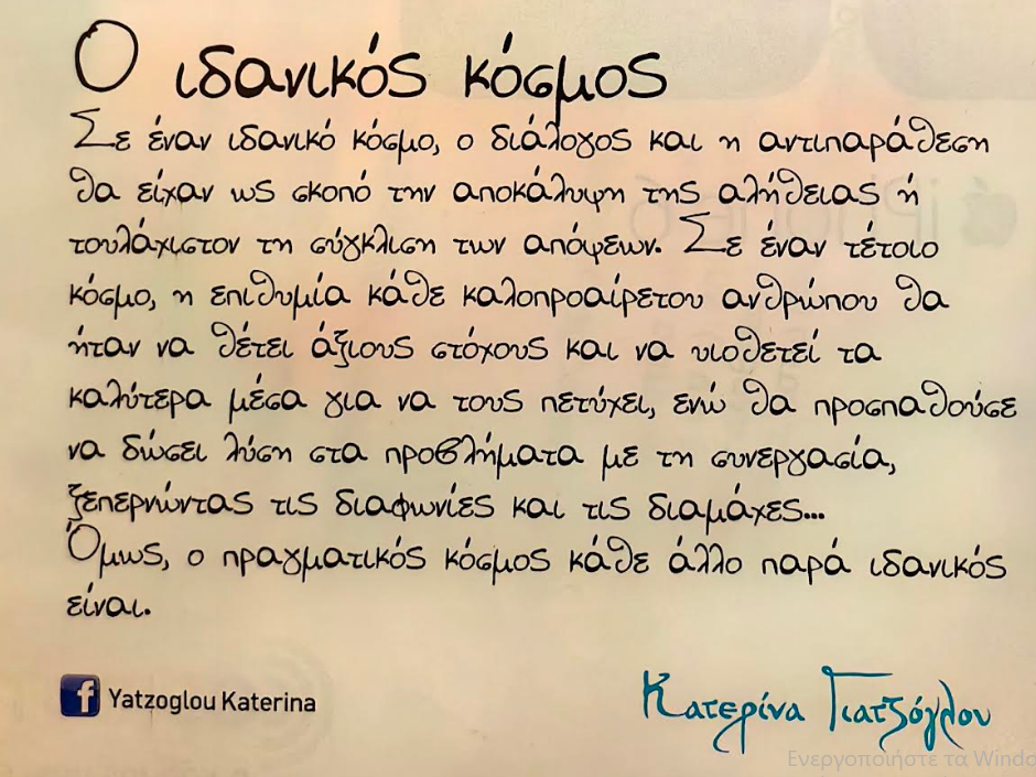 Σε έναν ιδανικό κόσμο, ο διάλογος και η αντιπαράθεση θα είχαν ως σκοπό την αποκάλυψη της αλήθειας ή τουλάχιστον την σύγκλιση των απόψεων. Σε έναν τέτοιο κόσμο, η επιθυμία κάθε καλοπροαίρετου ανθρώπου θα ήταν να θέτει άξιους στόχους και να υιοθετεί τα καλύτερα μέσα για να τους πετύχει, ενώ θα προσπαθούσε να δώσει λύση στα προβλήματα με την συνεργασία, ξεπερνώντας τις διαφωνίες και τις διαμάχες…