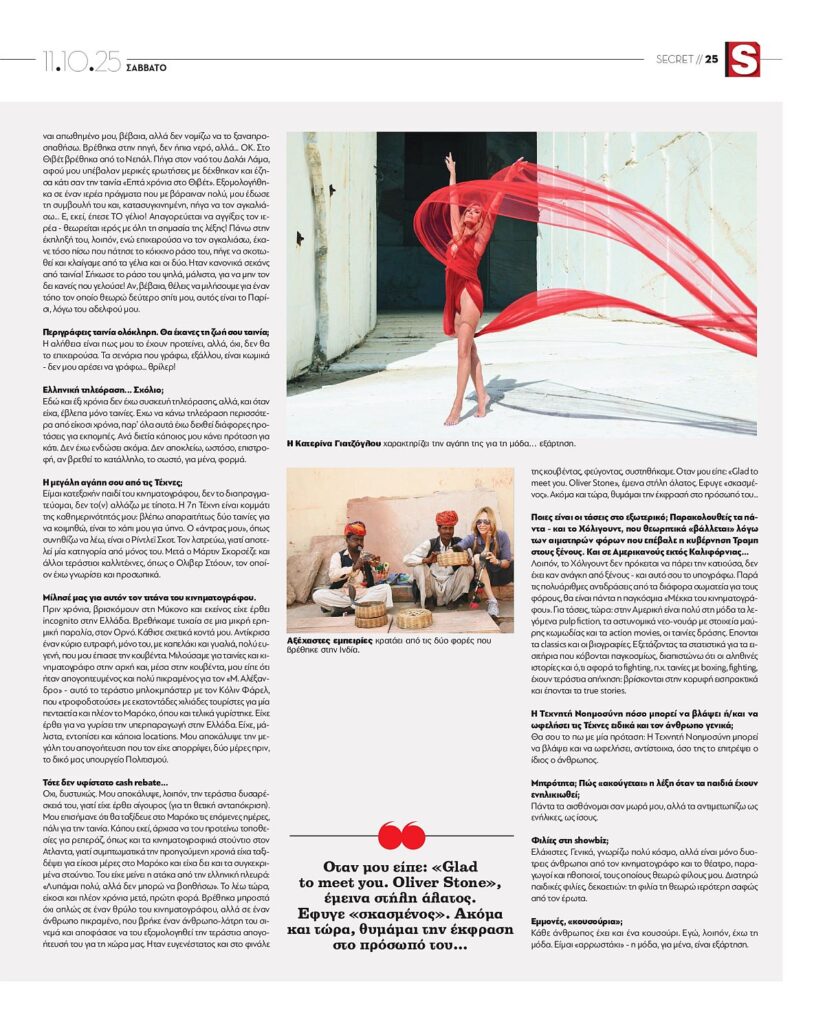 Όπως προέκυψε και μία ενδιαφέρουσα συνέντευξη στα Παραπολιτικά, με την Κατερίνα Γιατζόγλου να προχωράει σε μια αποκάλυψη που δεν γνωρίζαμε μέχρι σήμερα. Πιο συγκεκριμένα, για πρώτη φορά, αναφέρθηκε στην αναπάντεχη γνωριμία της με τον κορυφαίο σκηνοθέτη του Χόλιγουντ, Όλιβερ Στόουν, τον «Μίδα των επιτυχιών», ο οποίος στην τυχαία τους συνάντησή τους σε μια μικρή ερημική παραλία, στον Ορνό τής εκμυστηρεύτηκε την «πόρτα» που του έριξε το τότε υπουργείο Πολιτισμού για να κάνει γυρίσματα στην Ελλάδα για την ταινία, «Μέγας Αλέξανδρος», η οποία όταν κυκλοφόρησε, «έσπασε» τα ταμεία και μέχρι και σήμερα θεωρείται μία από τις πιο εμπορικές μπλοκμπάστερ όλων των εποχών.