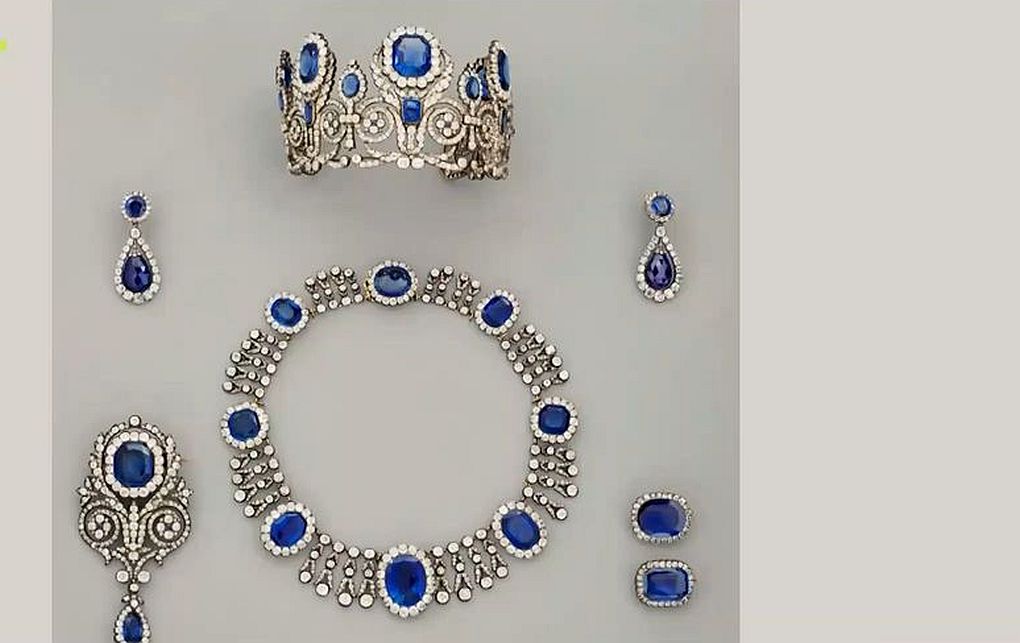 - Μια τιάρα, ένα κολιέ και ένα μονό σκουλαρίκι από το σετ με ζαφείρια που ανήκε στη βασίλισσα Μαρία-Αμαλία και στη βασίλισσα Ορτάνς.