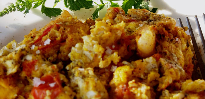 2. Σε ένα μπολ σπάτε τα αυγά και τα χτυπάτε ελαφρώς με ένα πιρούνι. Ρίχνετε τα αυγά στην κατσαρόλα με τις ντομάτες και ανακατεύετε συνεχώς σχηματίζοντας «οχτάρια» με μια ξύλινη κουτάλα. Βγάζετε την κατσαρόλα από την φωτιά πριν στεγνώσει το φαγητό εντελώς από τα υγρά.